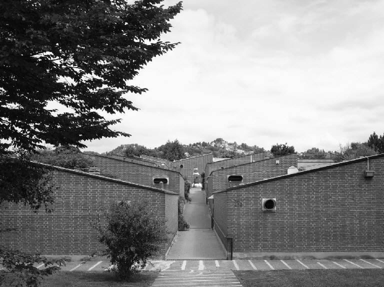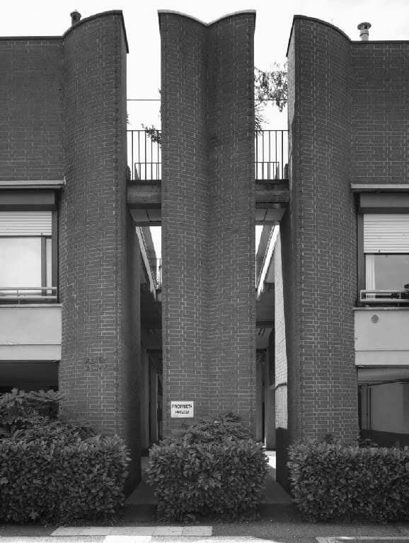 Le abitazioni a ferro di cavallo, distribuite intorno a un patio o giardino pensile, seguono l’andamento del terreno in direzione nord-sud, creando dislivelli che consentono la realizzazione di autorimesse interrate e blocchi artigianali su più quote. I tetti a falda inclinata, realizzati con pannelli prefabbricati in laterizio e calcestruzzo coibentati, contribuiscono a conferire al complesso un carattere quasi rurale. Le murature in mattoni pieni lasciati a vista, le persiane in legno, le porte d’ingresso a perline diagonali, i comignoli e le cuffie di areazione in cotto contribuiscono a creare un’atmosfera distintiva.